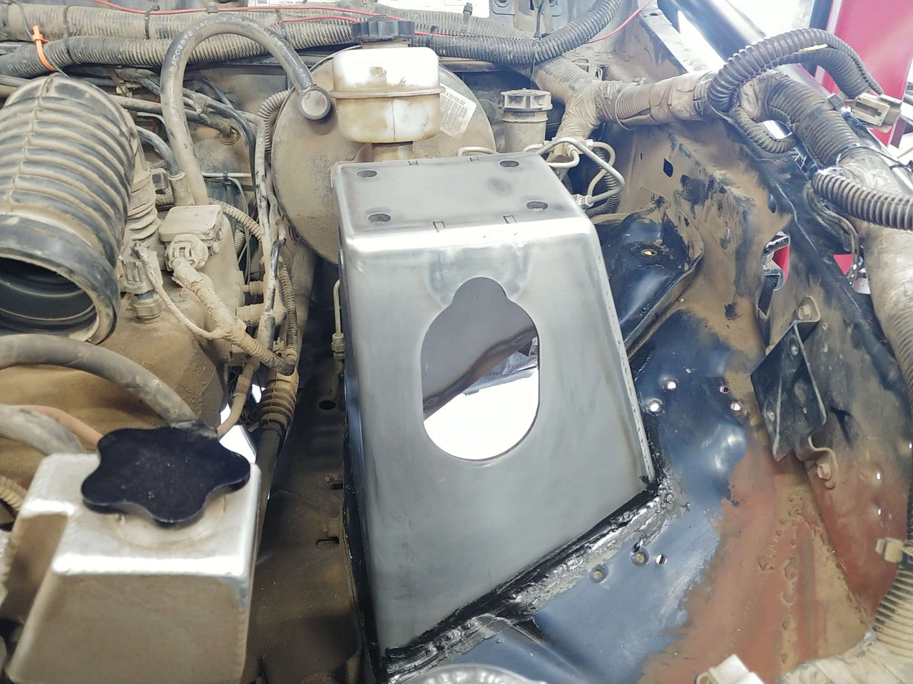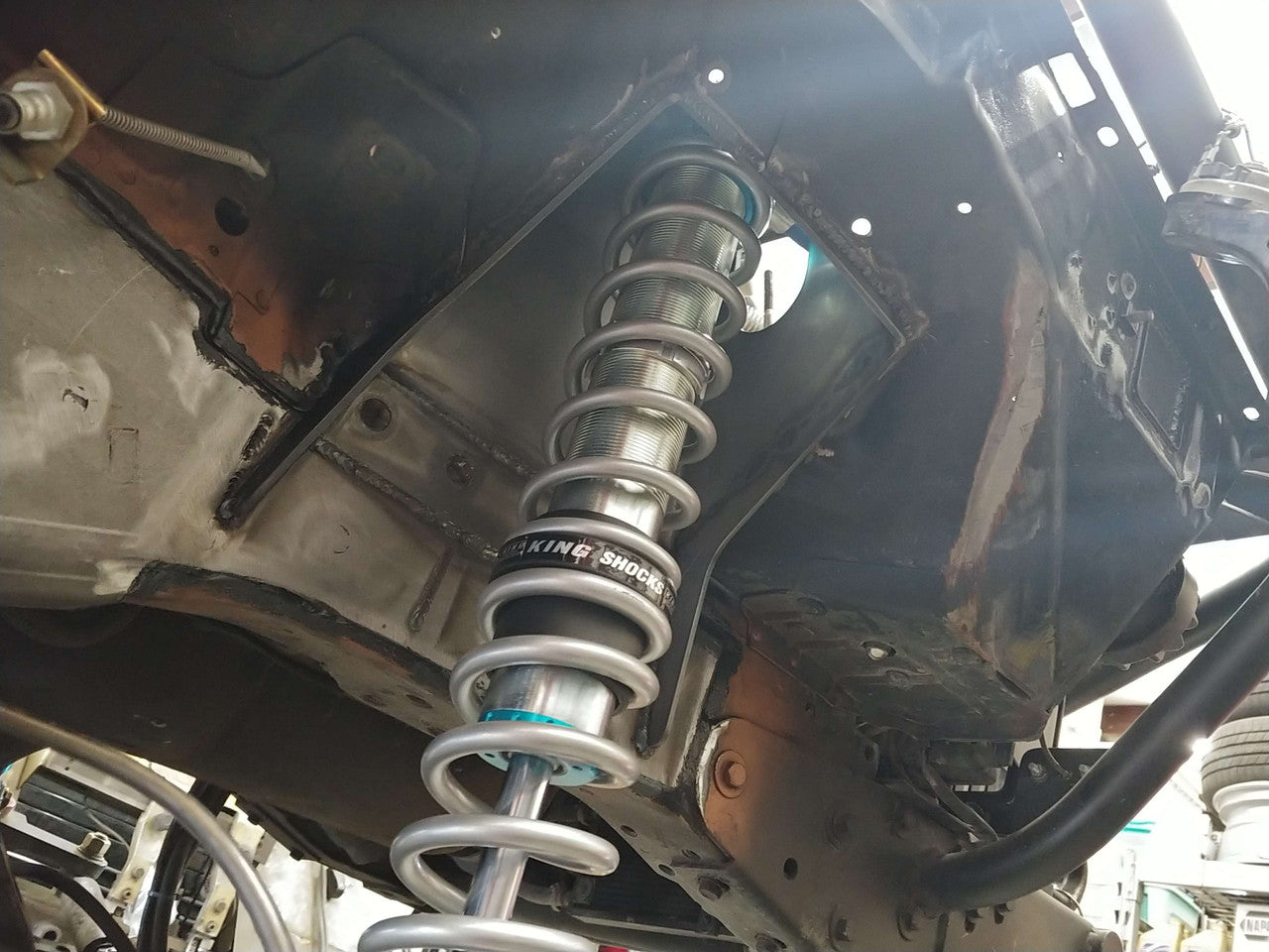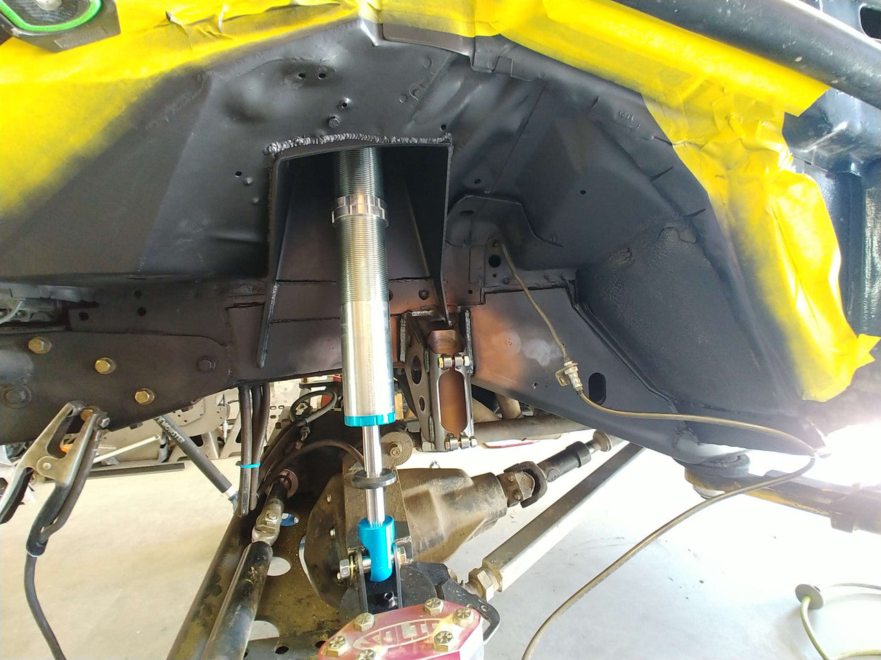 By welding these buckets onto the front frame stiffeners, and welding all around the factory wheelwell sheetmetal, along with a crossbrace across the top of the motor, these become a super strong shock mounting solution and become a part of the unibody.
