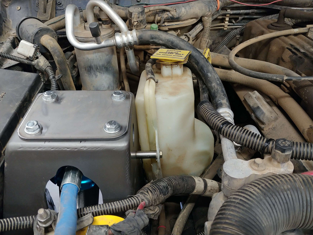 - There is enough room in the bucket for a remote reservoir with a 90 deg fitting so the hose comes down into the wheelwell area. Also, there is a hole in the front of the buckets that a remote reservoir with a straight hose can be routed into the engine bay.